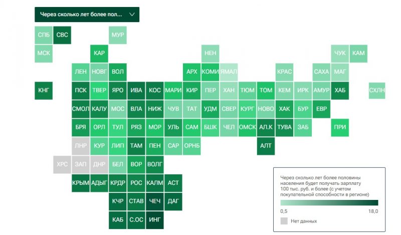 Что же касается общего вида рейтинговой таблицы регионов по динамике зарплат, то в ней первую строчку занял Ямало-Ненецкий автономный округ. Там уже через полгода больше половины граждан будут зарабатывать 100 и более тысяч рублей. На втором месте расположился Чукотский автономный округ, замыкает тройку Магаданская область. При этом отрыв от первого места у этих двух регионов составляет более 2 лет. Замыкают рейтинговую таблицу Республика Дагестан, Чеченская республика и Республика Ингушетия. В Ингушетии, по оценкам специалистов, лишь через 18 лет больше половины трудоспособного населения будут зарабатывать по 100 и более тысяч рублей.