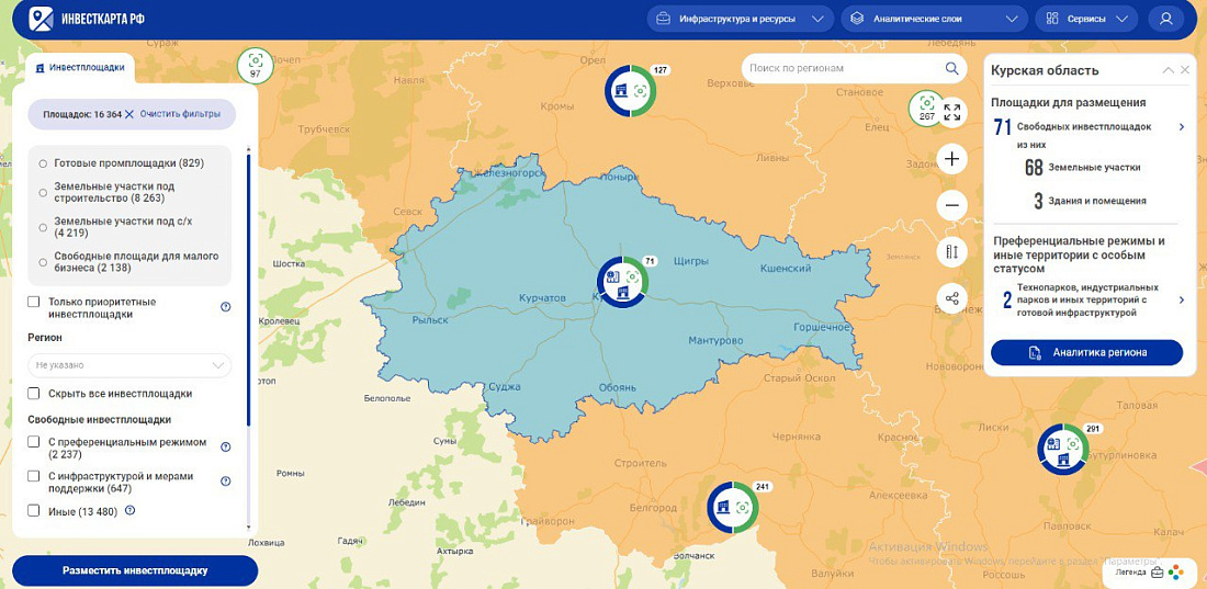 В конце февраля 2024 года была запущена инвестиционная карта России. На ней за это время было размещено более 16 тысяч инвестиционных площадок. 130 из них реализовали за последний месяц. Теперь на инвесткарте РФ свои площадки под аренду или покупку смогут размещать юридические и физические лица. В том числе из Курской области.
