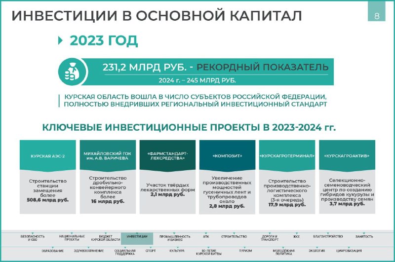 Всего общий объем инвестиционных вложений составил более 231 млрд. рублей – это рекордный показатель для региона. Основные инвестиционные проекты представлены на слайде.