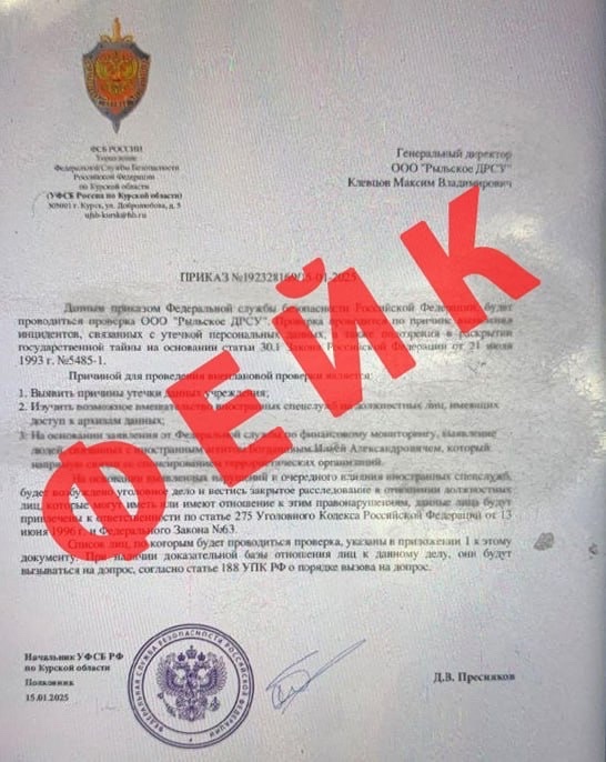 В социальных сетях продолжает тиражироваться недостоверная информации о «проведении проверок организаций в связи с передачей и распространением персональных данных граждан». Вбросы мошенников затронули сразу несколько организаций из Курской области, последней из них стало «Рыльское ДРСУ». В ближайшее время возможно появление серии новых поддельных «приказов», сообщают в Правительстве региона.