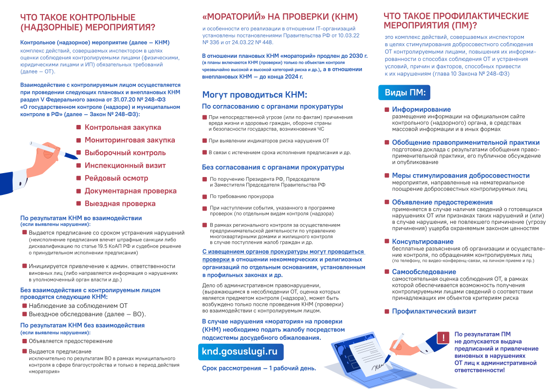 Что такое контрольные (надзорные) мероприятия? Как реализуется «мораторий» на проверки? Чем КНМ отличаются от профилактических мероприятий? Об этом и многом другом вы узнаете из информационного справочного буклета.
