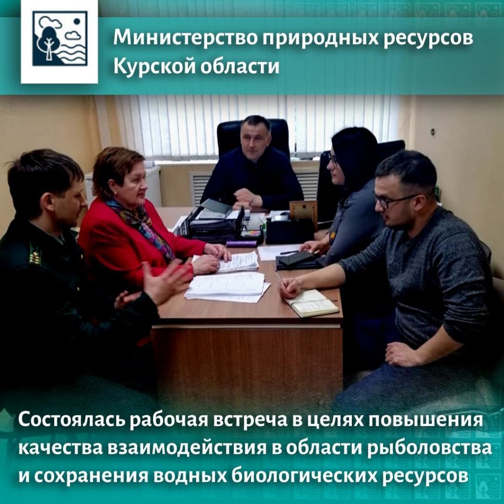 Состоялась рабочая встреча в целях повышения качества взаимодействия в области рыболовства и сохранения водных биологических ресурсов. В ней приняли участие заместители министра природных ресурсов Курской области, сотрудники отдела охотничьего контроля (надзора),а также заместитель руководителя и начальник отдела Московско-Окского территориального управления Федерального агентства по рыболовству.