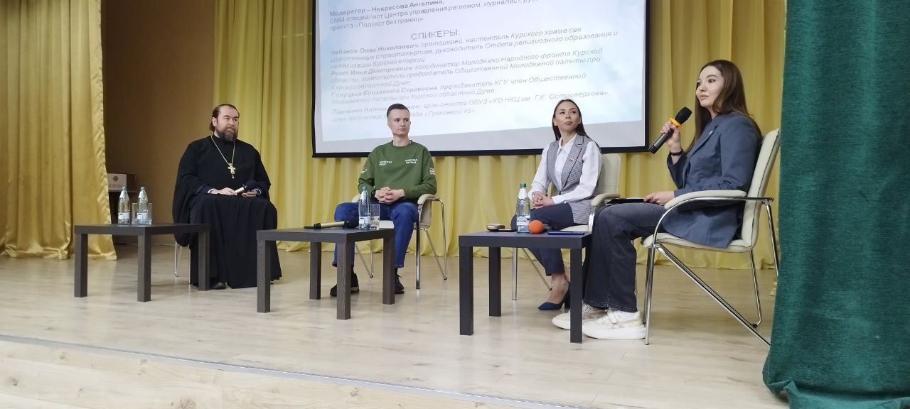 Формат встречи предполагал живое общение со школьниками. Так, спикерами стали объединённые общим делом земляки: председатель объединенной комиссии по религиозному образованию Курской митрополии протоиерей Олег Чебанов, координатор молодежного крыла Народного фронта в Курской области Илья Роот, преподаватель КГУ и член общественно-волонтёрской палаты при Курской областной Думе Елизавета Галуцких и SMM-специалист ЦУР Курской области Ангелина Некрасова.