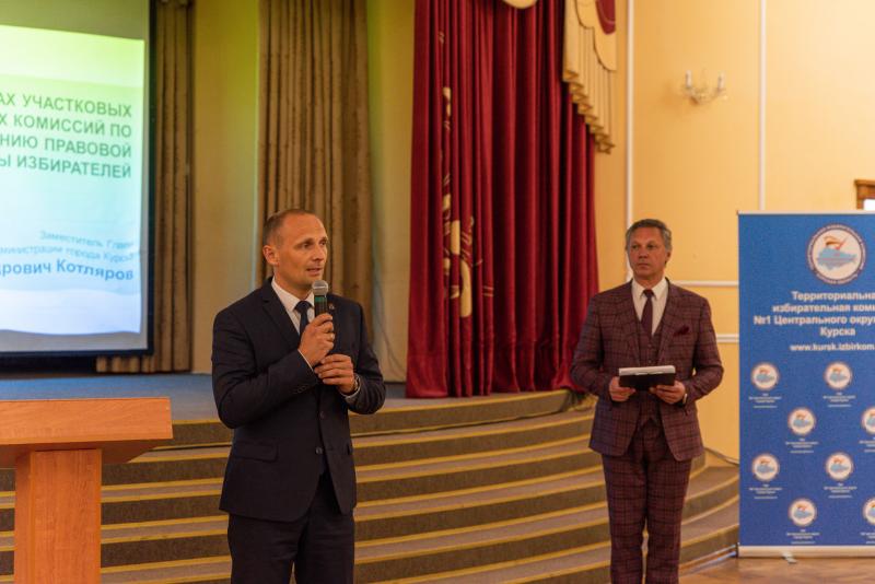На совещании заместитель главы администрации города Сергей Котляров, и.о. главы администрации Центрального округа Юлия Романчук, председатель избирательной комиссии Курской области Татьяна Малахова, председатели ТИК № 1 и № 2 Центрального оруга Сергей Кисляк и Игорь Черкашин вручили присутствующим удостоверения председателей участковых избирательных комиссий.