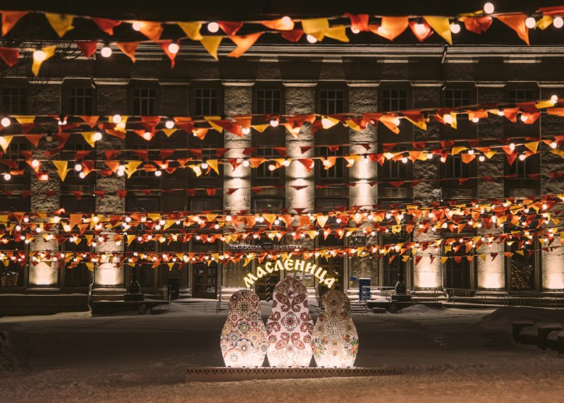 Вся площадка стала большой фотозоной. Сделать атмосферные снимки можно и днем на фоне нарядных матрешек, и вечером с праздничной иллюминацией.