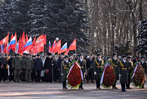 Движение к Вечному огню началось под звуки легендарной песни "От героев былых имен..." Над строем реют государственные флаги и знамена Победы, их соседство – символ преемственности великих воинских традиций в нашей стране. Вечный огонь окружен братскими могилами погибших и умерших от ран солдат и офицеров, защитников Северного фаса. Минутой молчания вспоминали и героев Донбасса, и российских военнослужащих, погибших во время спецоперации.