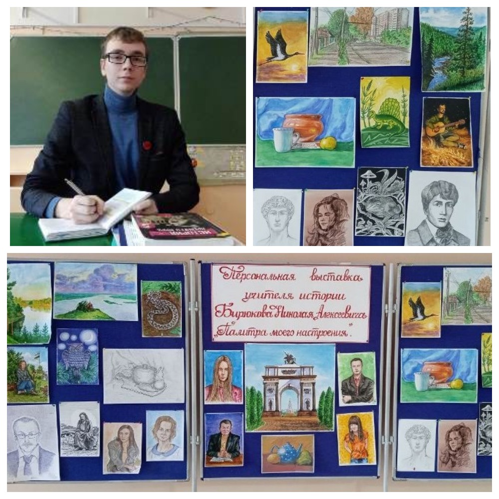 В рамках Года педагога и наставника в холле школы №5 прошла персональная выставка рисунков «Палитра моего настроения» учителя истории Бирюкова Николая Алексеевича.