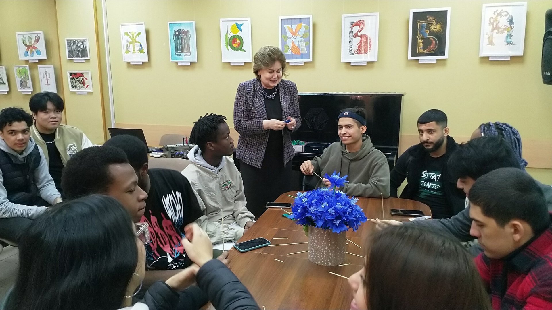 Ребята познакомились с историей благотворительности в России и в Курске, а затем сделали из бумаги синие цветы. На французском, персидском, испанском, китайском, арабском и русском языках они поделились впечатлениями и пожелали удачи проекту.