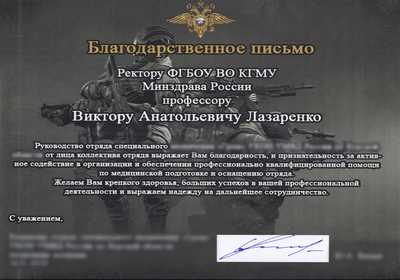 В адрес ректора университета Виктора Анатольевича Лазаренко поступает много слов благодарности от солдат различных родов войск. Так, руководство отряда специального назначения передало Благодарственное письмо со словами: «Выражаем Вам благодарность и признательность за активное содействие в организации и обеспечении профессиональной квалифицированной помощи по медицинской подготовке и оснащению отряда. Желаем Вам крепкого здоровья, больших успехов в Вашей профессиональной деятельности».