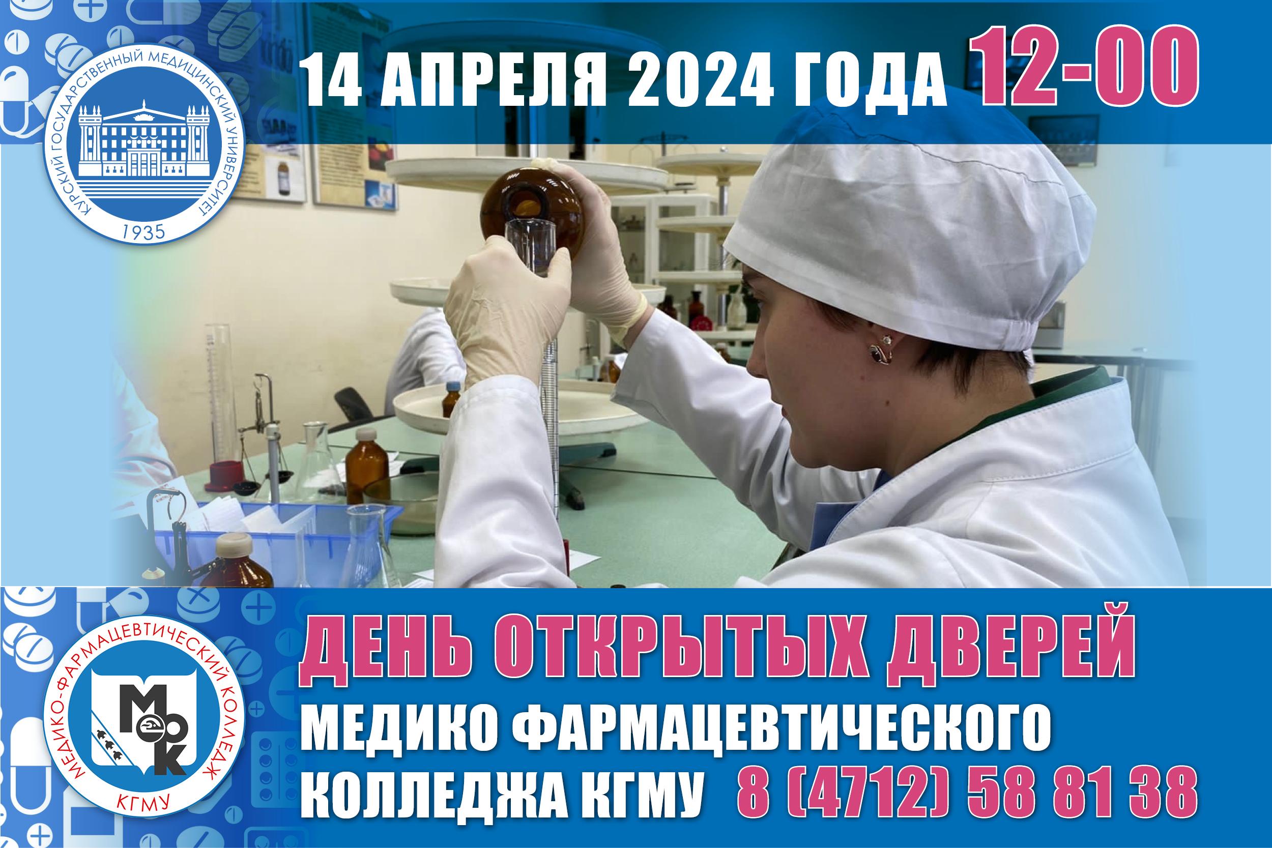 14 апреля 2024 г. в 12-00 Курский государственный медицинский университет проводит «День открытых дверей медико-фармацевтического колледжа».