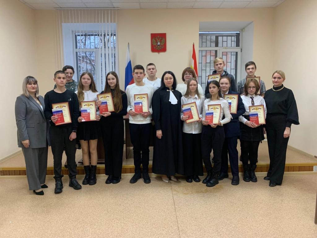В зале судебного заседания мировой судья Галина Сибилева познакомила ребят с историей Конституции, последними изменениями, внесенными в Основной Закон. Затем ребята разделились на две команды — «Совесть» и «Закон» и сразились в интеллектуальной игре «Я — гражданин России».