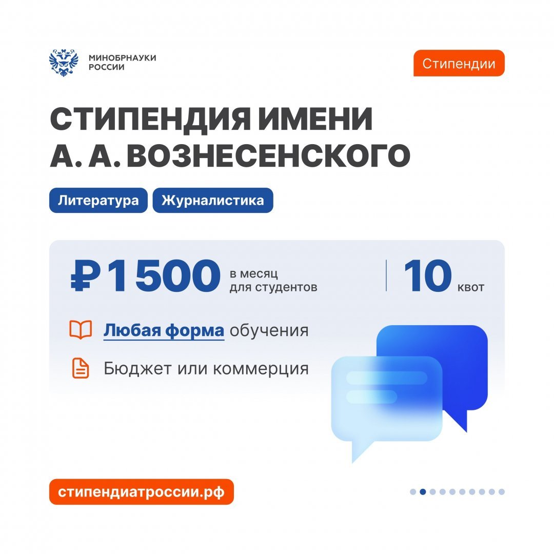 Основную информацию о стипендиях и список необходимых документов вы найдете в наших карточках. Подробности читайте на сайте стипендиатроссии.рф https://стипендиатроссии.рф/ в разделе «Именные стипендии». Удачи!