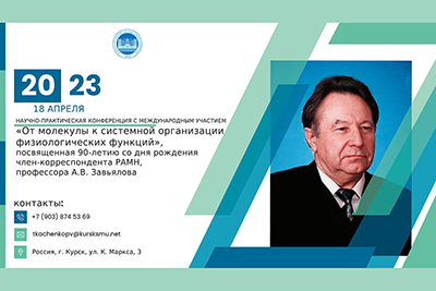 18-20 апреля 2023 года в Курском государственном медицинском университете состоялась научно-практическая конференция с международным участием «От молекулы к системной организации физиологических функций», посвященная 90-летию со дня рождения член-корреспондента РАМН, заслуженного деятеля науки РСФСР, доктора медицинских наук, профессора Александра Васильевича Завьялова.