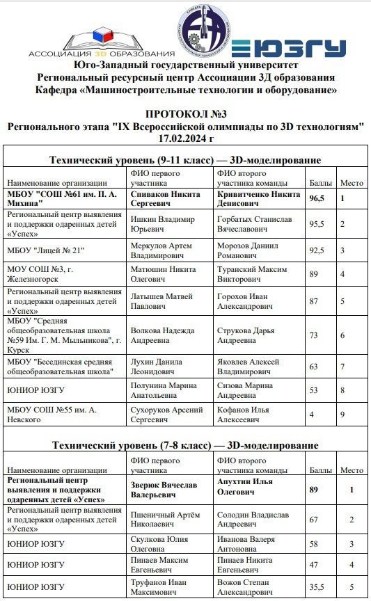 В ЮЗГУ завершился региональный этап IХ Всероссийской олимпиады по 3Д технологиям.