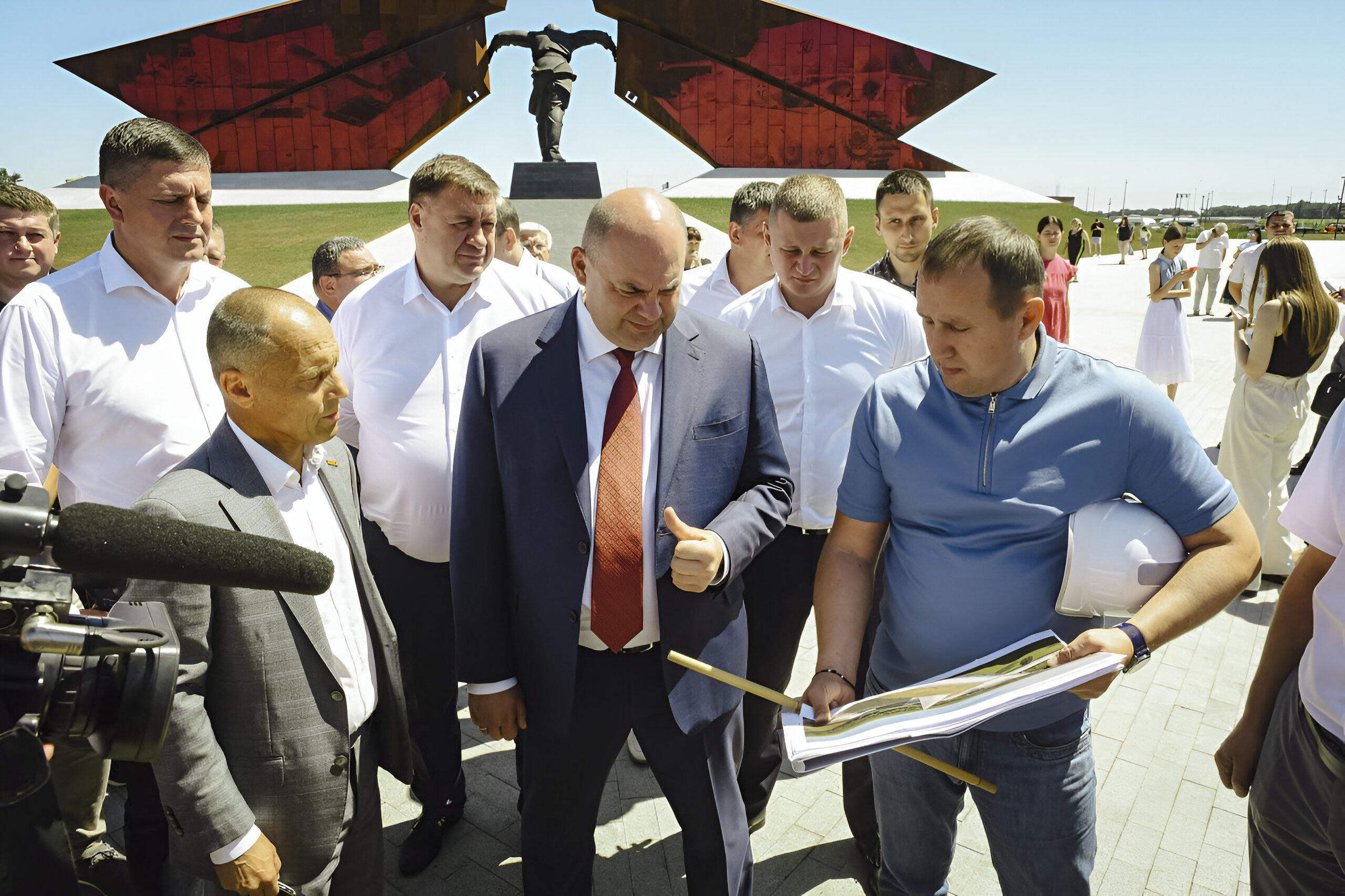 Следующим пунктом в маршруте стал мемориальный комплекс «Курская битва». В 2025 году, к 80-летию победы в Великой Отечественной войне, здесь должны открыть для посещения его вторую очередь. Работы по её созданию уже начались. Сейчас на площадке снимают грунт и отсыпают территорию песком.