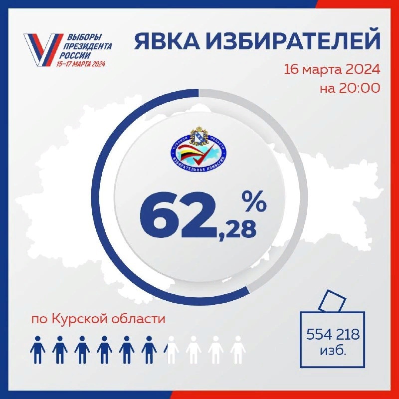 Итого явка избирателей по Курской области на 20:00 часов составила 554 218 человек, или 62,28 процента.