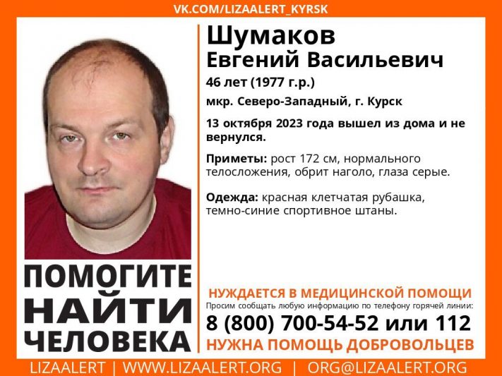 В Курске пропал 46-летний Евгений Васильевич Шумаков.