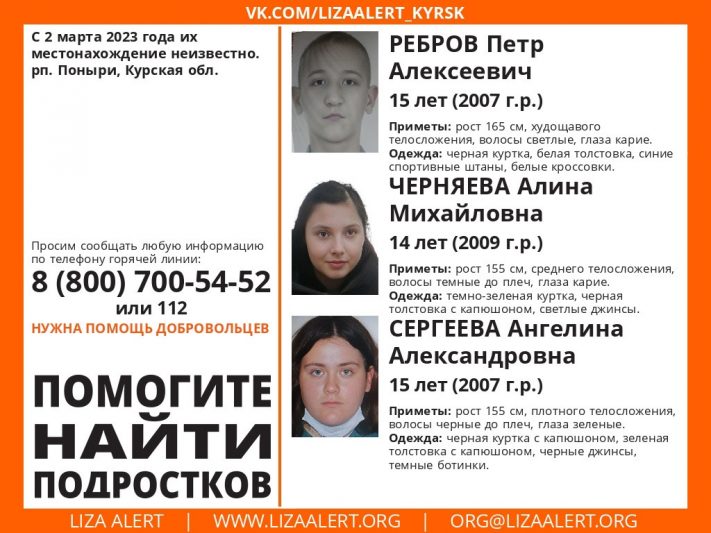 В Курской области ищут трех несовершеннолетних. Со 2 марта 2023 года их местонахождение неизвестно. Пропал Петр Алексеевич Ребров. Молодому человеку 15 лет, был одет в черную куртку, белую толстовку, синие спортивные штаны и белые кроссовки. Приметы: рост 165 см, худощавого телосложения, волосы светлые, глаза карие.