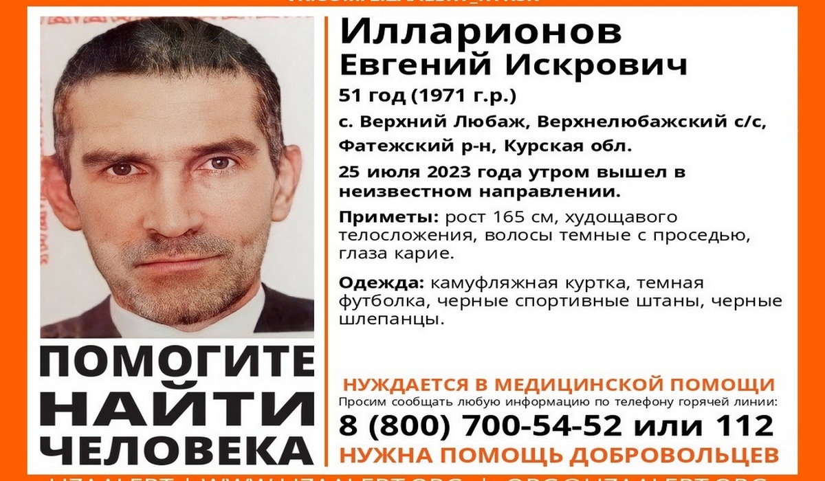 Волонтеры поискового отряда «Лиза Алерт» рассказали о том, что в Курской области пропал 51-летний житель Фатежского района Евгений Илларионов.