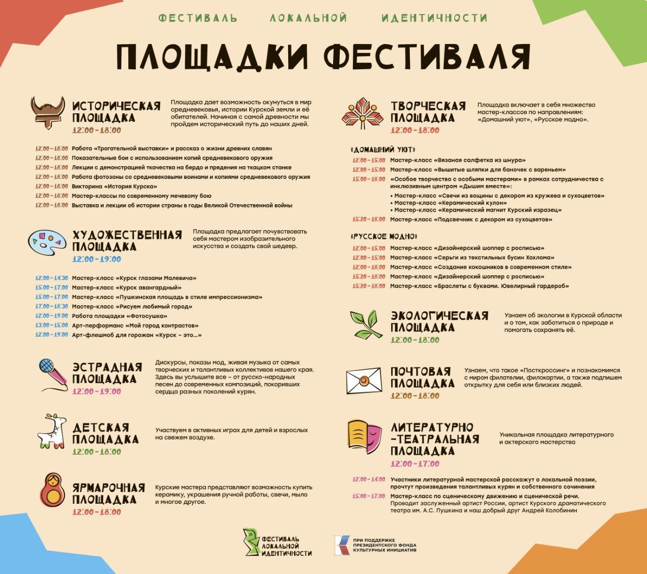 Сам фестиваль проводится при поддержке Президентского фонда культурных инициатив Центром поддержки молодежных инициатив города Курска и резидентами креативного пространства «Веранда». Гости мероприятия смогут посетить 11 площадок с выставками, креативными мастерскими, мастер-классами и многим другим, что позволит погрузиться в атмосферу культурного праздника.Время работы площадок: