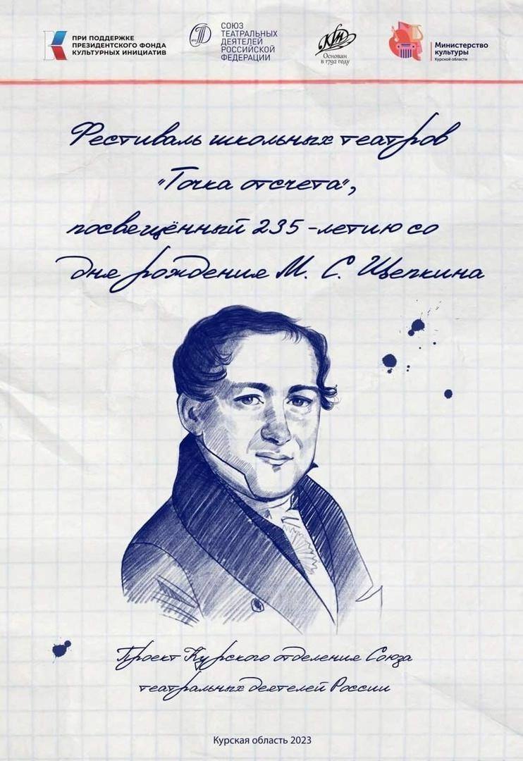 Продолжается прием заявок на фестиваль школьных театров «Точка отсчета», посвященный 235-летию со дня рождения М. С. Щепкина, который проводится Курским отделением Союза театральных деятелей России совместно с Курским государственным драматическим театром имени А.С. Пушкина при поддержке Президентского фонда культурных инициатив.