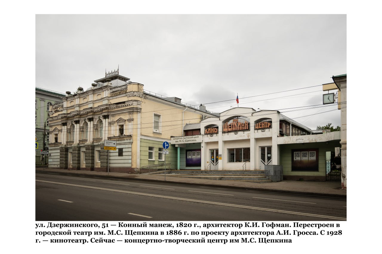 В 1820 году в начале улицы был построен манеж для верховой езды. Спустя 55 лет после пожара здание Дворянского собрания быстро приспособили под театр. В 1886 году бывший манеж перестроили в городской театр, а в 1911 году ему было присвоено имя Михаила Щепкина. Здесь выступала театральная труппа до 1927 года, после чего она перешла в Дом Ильича, а здание бывшего театра стало кинотеатром.