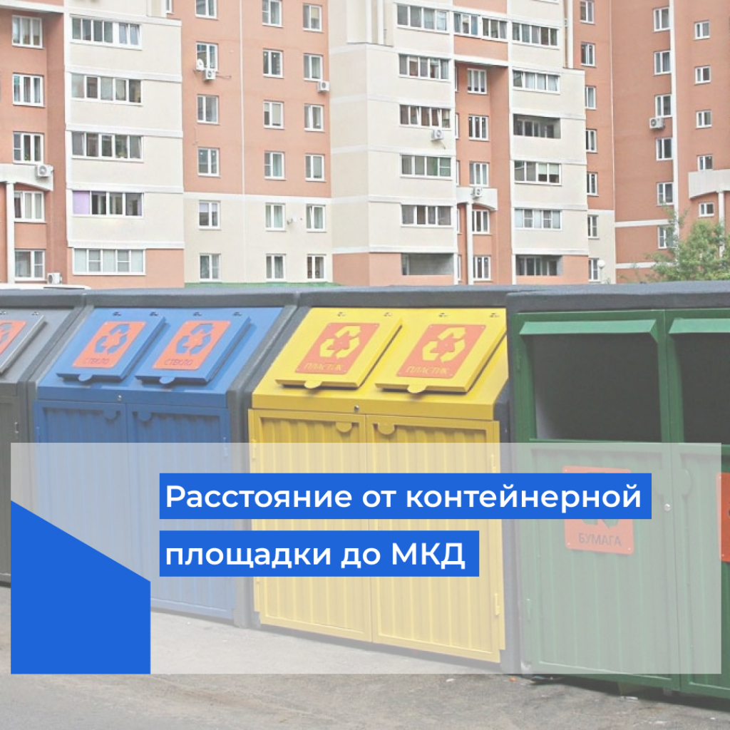 Расстояние от контейнерной площадки до МКД, детских и спортивных площадок должно быть не менее 20, но не более 100 метров.