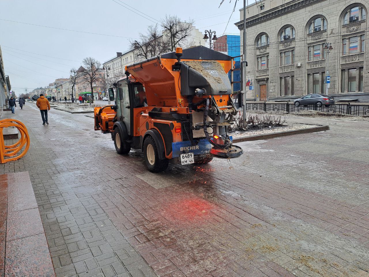 15 февраля коммунальные службы обрабатывали тротуары и проезжие части после перепада температур.