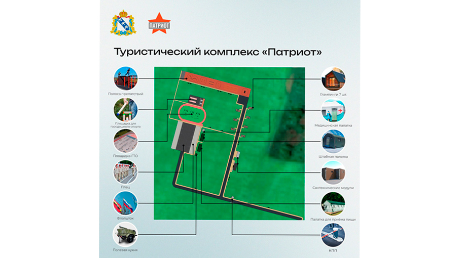 На территории туристического комплекса «Патриот» начнёт работать военно-патриотический лагерь. Работа лагеря будет заключаться в тренировках по строевой и физической подготовке и изучению основ военного искусства и техники. Помимо этого на территории комплекса планируют установить штабную и медицинскую палатки, полевую кухню.