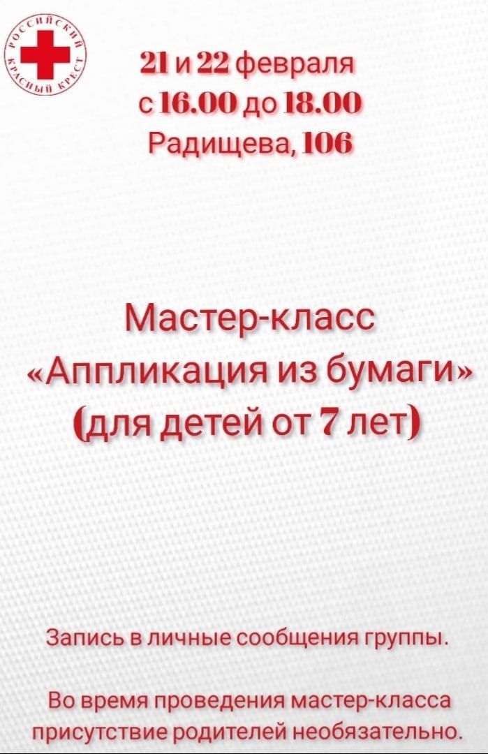 Он состоится 20 и 21 февраля с 16:00 до 18:00 по адресу: улица Радищева, 106. Для подтверждения участия нужно написать в личные сообщения группы Красного Креста https://vk.com/rusredcross46 ФИО родителя, ФИО ребёнка и возраст. С собой необходимо иметь сменную обувь и хорошее настроение. Во время проведения мастер-класса присутствие родителей необязательно.Последние новости