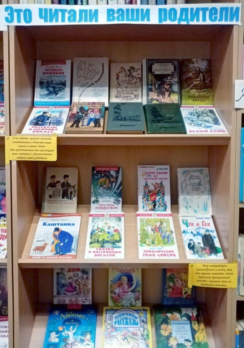 Знакомясь с выставкой, юные читатели в первую очередь видят такое обращение: «А вы знаете, какими книгами зачитывались в детстве ваши мамы и папы? Нет? Мы представляем вам коллекцию книг, которые с удовольствием читали ваши родители! Мир литературы разнообразен и велик, так что ищите, читайте, идите дорогами приключений вместе с героями книг из маминого детства».