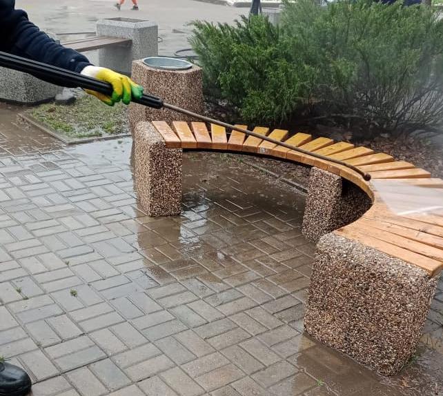 Подрядчик уже демонтировал зимнее укрытие фонтана на улице Ленина, промыл его гранитную облицовку и тротуарную плитку специальным средством.