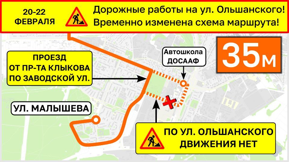 Автобусы 35м вместо участка Сумской и Ольшанского будут следовать по Заводской улице без заезда на остановку «Автошкола ДОСААФ».