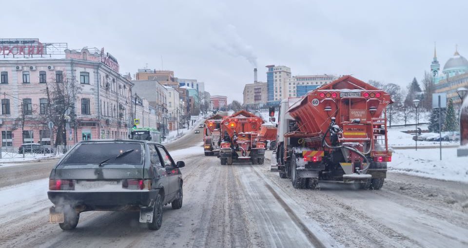 Идут расчистка и обработка песко-соляной смесью проезжей части и тротуаров города.