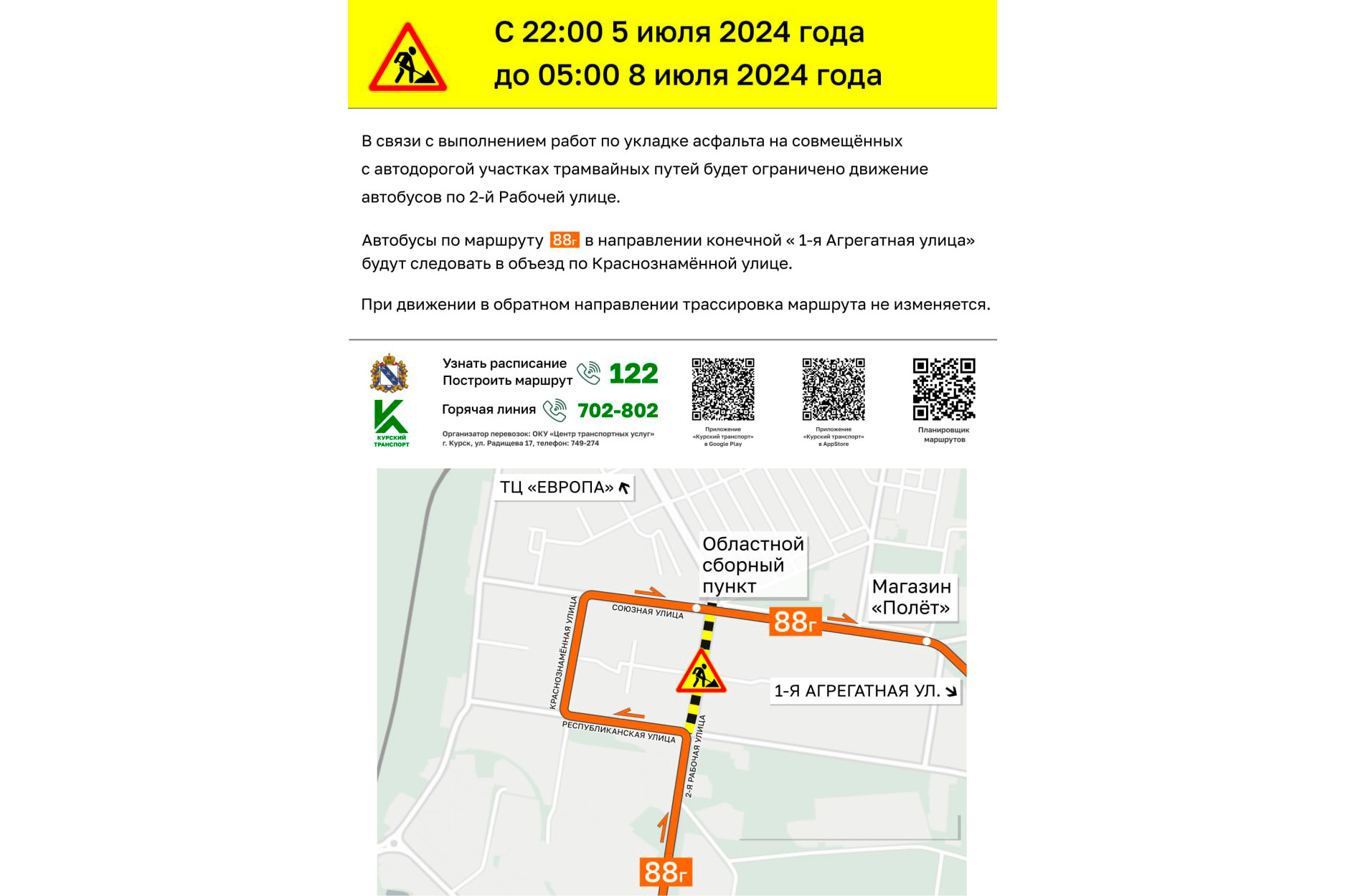 Изменится схема проезда общественного транспорта. Автобусы с маршрутом 88г с конечной остановкой «1-я Агрегатная улица» на время запрета будут проезжать на Краснознамённой улице. В обратном движении маршрут не изменится.