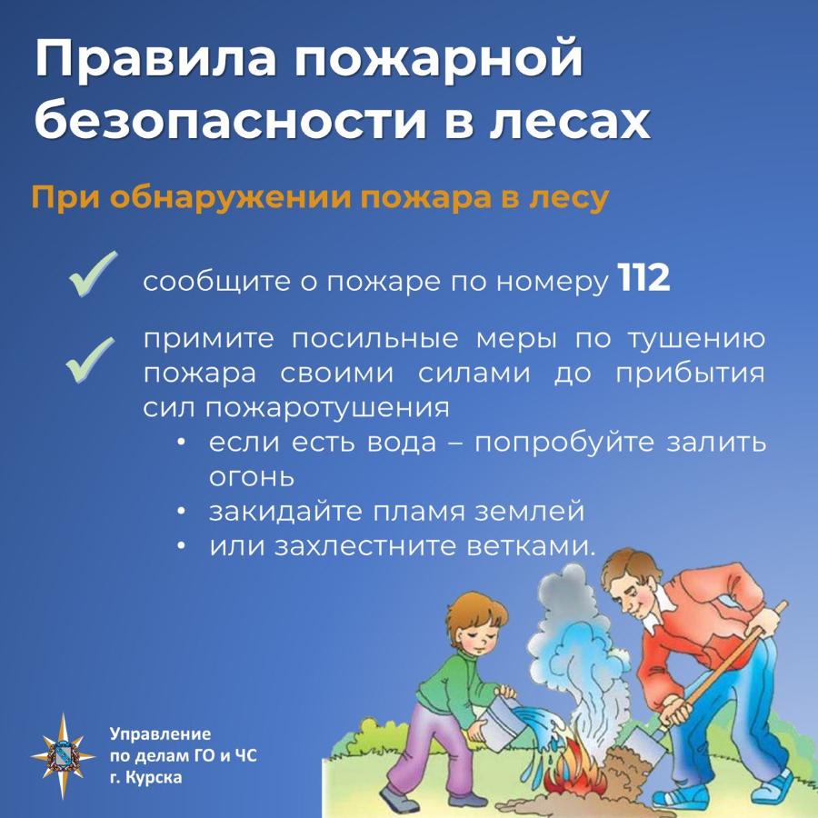 «В случае обнаружения лесного пожара следует незамедлительно сообщить о нём по номеру экстренных оперативных служб 112. И по возможности принять меры по тушению пожара своими силами до прибытия специалистов», — отметили в администрации Курска.