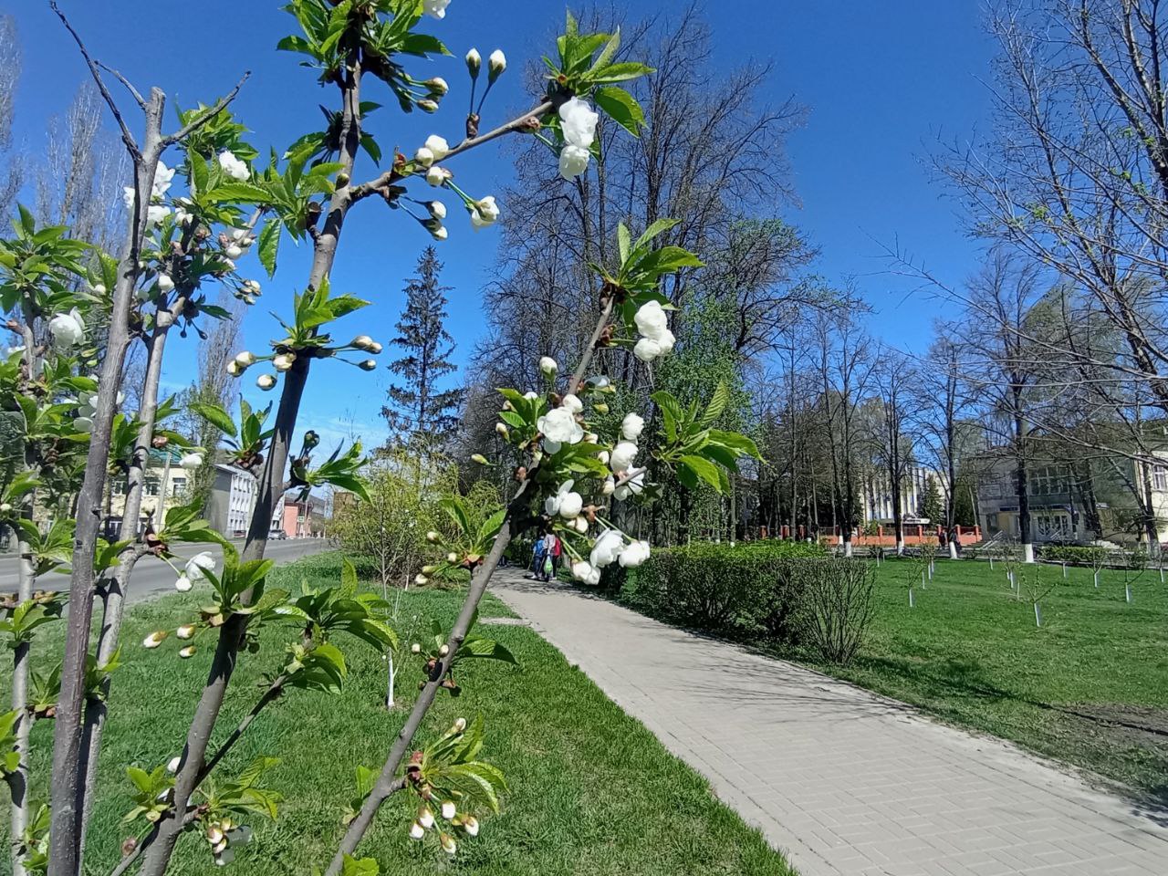 В Железнодорожном округе Курска в Саду Победы побелили деревья