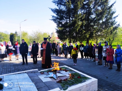 По окончании Литургии был совершен благодарственный молебен Господу Богу за дарование победы в Великой Отечественной войне. Затем у памятника павших воинов протоиерей Андрей Еськов возглавил служение панихиды по усопшим воинам, за веру, Отечество и народ жизнь свою положивших, и всех, страдальчески погибших в годы Великой Отечественной войны 1941–1945 годов.