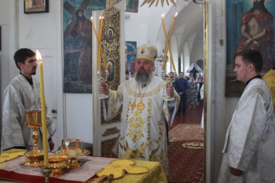 По заамвонной молитве Преосвященнейший Владыка совершил отдание праздника Преображения Господня, после троекратного каждения праздничной иконы, возлежавшей на украшенном цветами аналое в центре храма, при пении величания праздника, она была занесена архипастырем в алтарь.