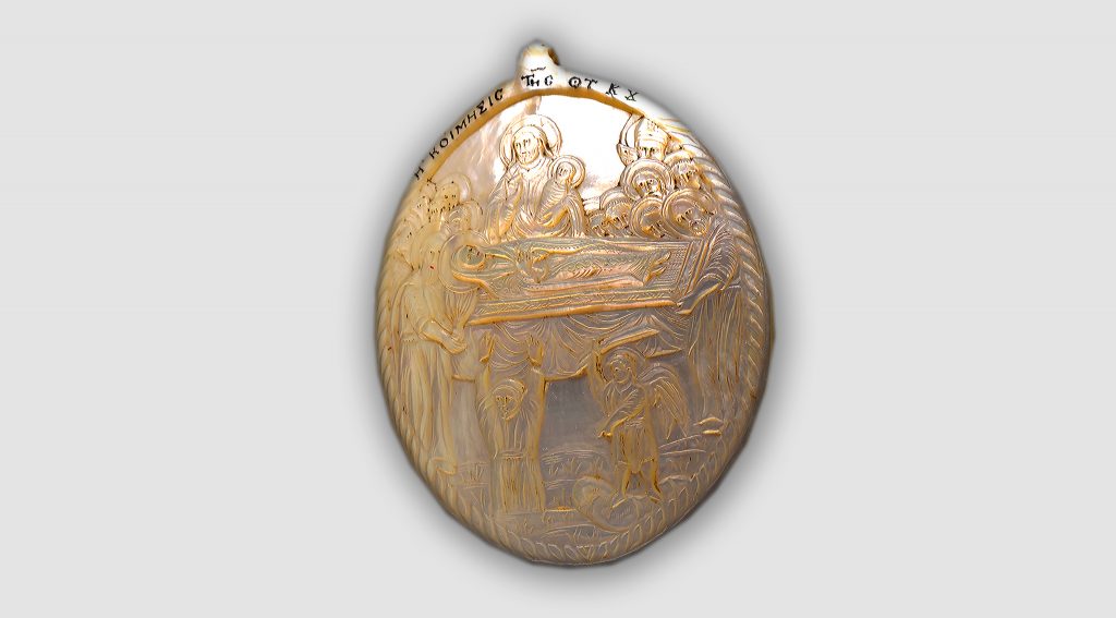Икона резная Успение Богородицы. Начало 20 века. Перламутр . Из фондов Курского областного краеведческого музея.
