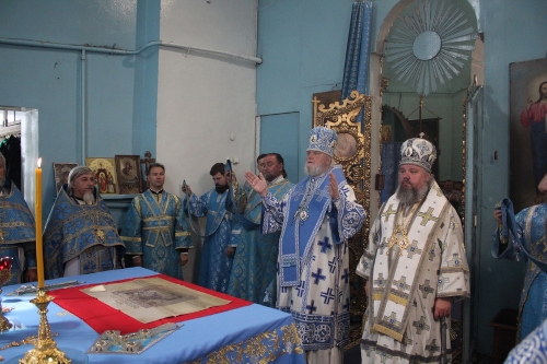 По окончании Литургии архипастыри с клиром и паствой совершили Крестный ход, духовенство и все прихожане обошли вокруг старинного храма с чтимой храмовой иконой. У алтаря было прочитано Евангельское зачало, а на каждой из 4-х сторон храма митрополит Герман и епископ Паисий окропляли молящихся святой водой.