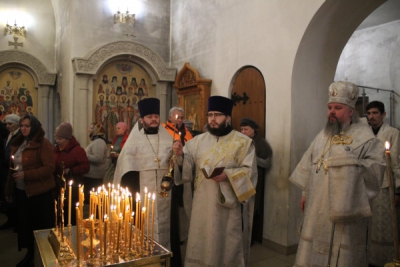 Его Преосвященству сослужили: настоятель храма иерей Игорь Лесько, иеромонах Феодосий (Скотаренко), диакон Алексей Богатырев.
