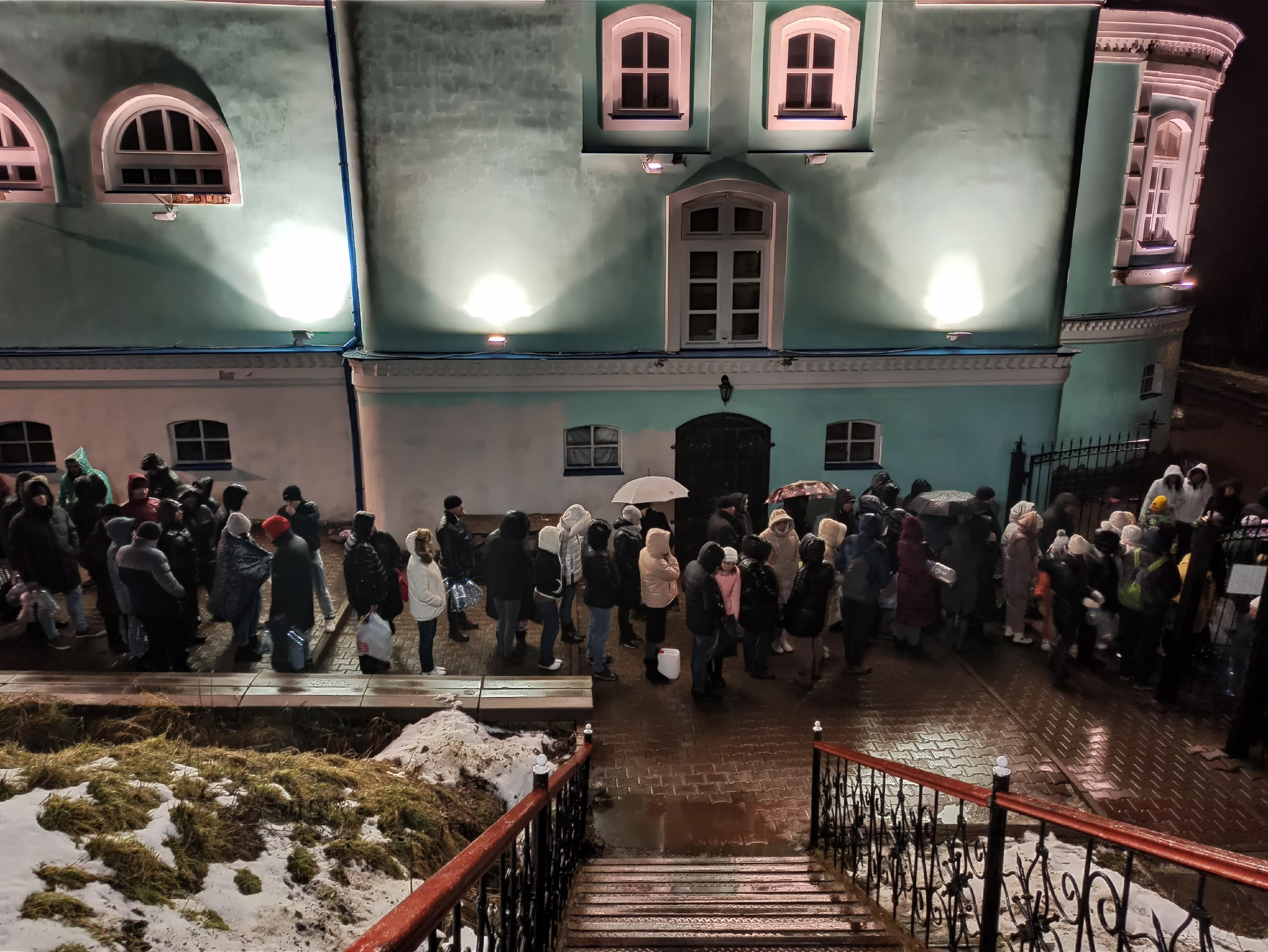 После погружения в воду паломники бегут согреться: на берегу установлены две обогреваемые палатки. Время приближается к полуночи, а у проруби светло, как днём: установлены два световых прожектора.