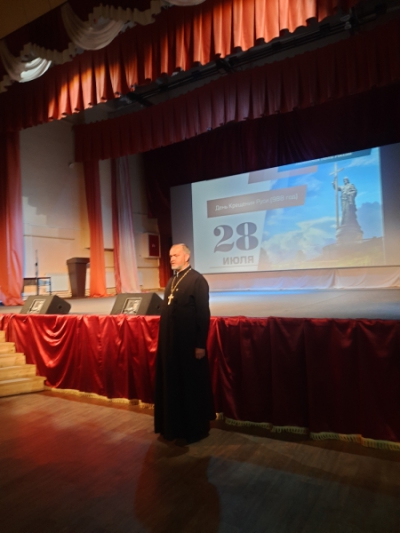 Поздравить всех жителей со знаменательным событием пришел настоятель Покровского храма п. Пристень иерей Иоанн Суринец, который обратился к собравшимся: «День Крещения Руси – памятная дата, законодательно установленная в Российской Федерации 1 июня 2010 года. Отмечается этот праздник 28 июля, как день, соответствующий дню памяти Киевского князя Владимира, почитаемого равноапостольным крестителем Руси, которого историки назвали великим, церковь — святым равноапостольным, а народ прозвал Владимиром Красное Солнышко.