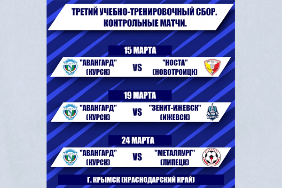 Определились соперники нашей команды в контрольных матчах третьего учебно-тренировочного сбора: 15-го марта бело-синие померятся силами с новотроицкой "Ностой", 19-го марта состоится футбольный поединок с ижевским "Зенитом", а 24-го марта куряне встретятся с липецким "Металлургом".