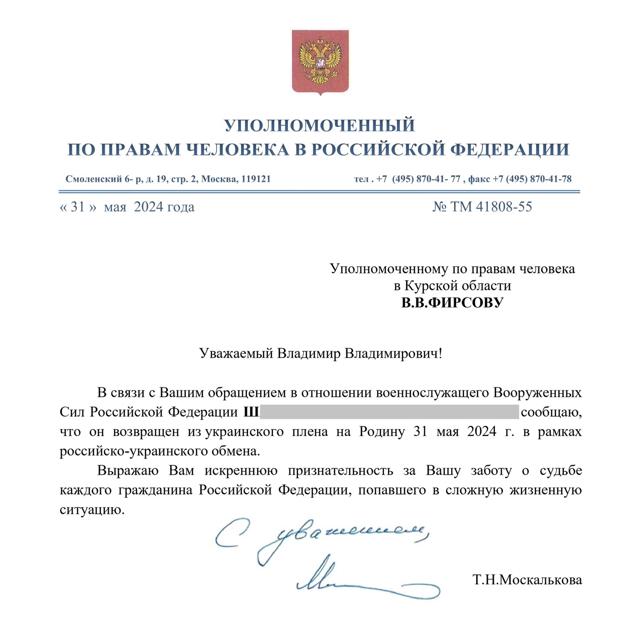 Курский омбудсмен во взаимодействии с Уполномоченным по правам человека в РФ Татьяной Москальковой и Министерством обороны РФ провели работу по признанию военнослужащего пленным и включению его в списки обмена.