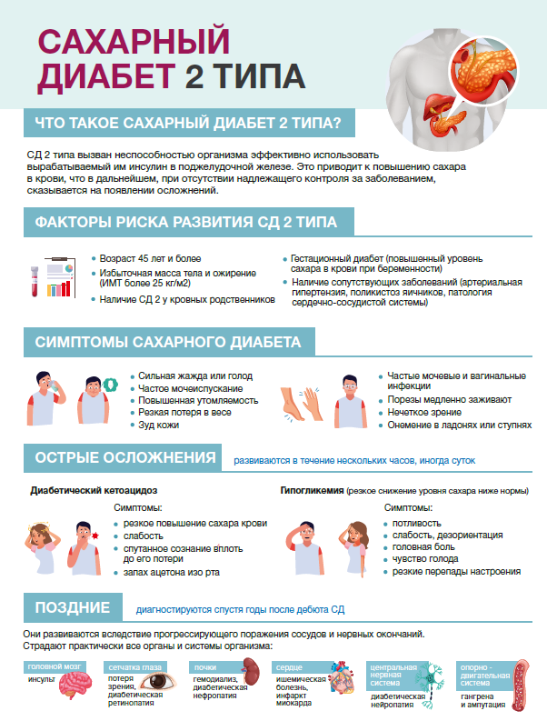 Сахарный диабет может привести к повреждению многих органов, к опасным для жизни осложнениям, таким как: сердечно-сосудистые заболевания (ССЗ) с развитием сердечной недостаточности, поражение периферических нервов с развитием полинейропатии, поражение почек (нефропатия и почечная недостаточность), заболевания глаз, что приводит к снижению остроты зрения и даже слепоте. Однако, при ранней диагностике и соответствующем лечении диабета, эти серьезные осложнения можно отсрочить или вообще предотвратить.