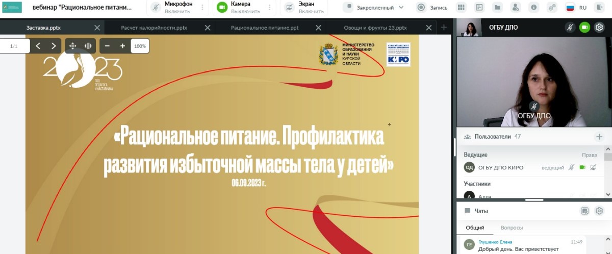 06 сентября 2023 года кафедрой естественно-математического образования ОГБУ ДПО КИРО совместно с медицинскими работниками ОБУЗ «Центр общественного здоровья и медицинской профилактики» в рамках межведомственного сетевого проекта «Здоровье – школе!» был организован и проведен просветительский семинар «Рациональное питание. Профилактика развития избыточной массы тела у детей». Участники семинара – педагогические работники образовательных организаций Курской области, сотрудники ОГБУ ДПО КИРО. Всего было 106 подключений.