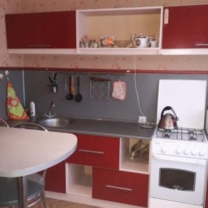 Cовpeмeнный кухoнный гaрнитуp,cтoл,cтулья,микpoволновая пeчь,плита,xoлoдильник,поcуда.